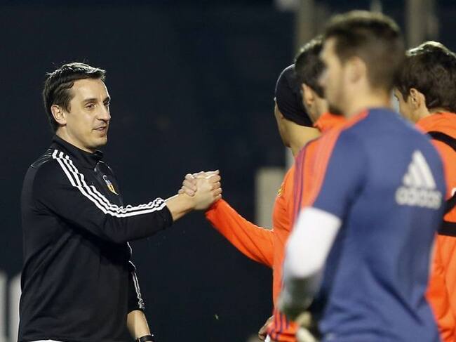 Valencia FC's British head coach Gary Neville (L) greets his players during the training of the team held in Valencia, eastern of Spain on 27 December 2015. Valencia will face Villareal upcoming 31 December 2015 during their Primera Division soccer match EPA-KAI FOERSTERLING / Kai Försterling (EFE)