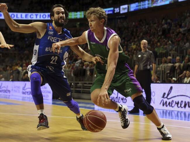 Kuzminskas penetra a canasta ante Grimau / Carlos Diaz (EFE)