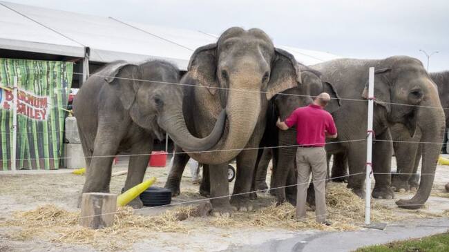 Un integrante de los circos de los Hermanos Ringling y el circo Barnum y Bailey cuida elefantes / CRISTOBAL HERRERA (EFE)