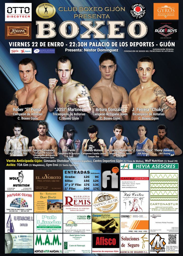 Todo esto acompañado por el habitual espectáculo de luces, sonido y animación del Club Boxeo Gijón. Presentada por Néstor Domínguez. Una cita que los aficionados al boxeo no podrán perderse.