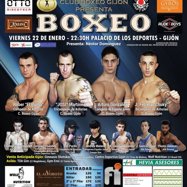 Llega a Gijón la primera velada de boxeo del año. Este viernes, el Palacio de Deportes de Gijón acoge una velada plagada de campeones de España y Asturias y organizada por el Club Boxeo Gijón-Shotokan. El cartel se presenta espectacular, con los mejores boxeadores asturianos, con grandes enfrentamientos ante importantes rivales de toda España.