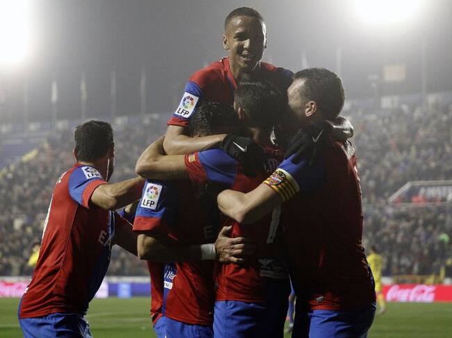 El delantero del Levante José Luis Morales celebra su gol, primero del equipo frente a la U.D. Las Palmas, con sus compañeros, durante el partido de la vigésimo primera jornada de Liga en Primera División que se disputa esta noche en el estadio Ciutat de / Kai Försterling (EFE)