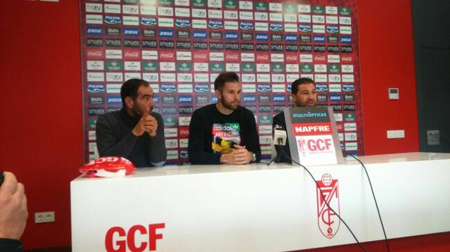 El portero del Granada CF, Jesús Fernández (c) comparece en rueda de prensa / Alberto Flores (Radio Granada)
