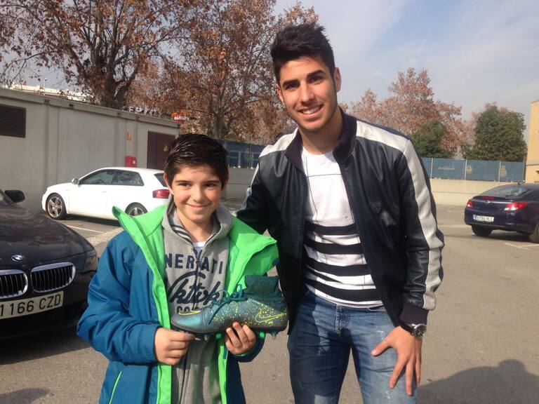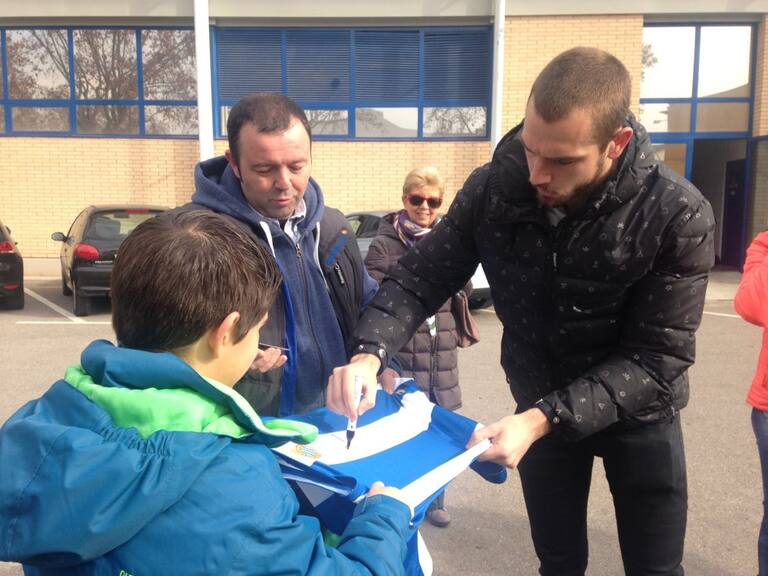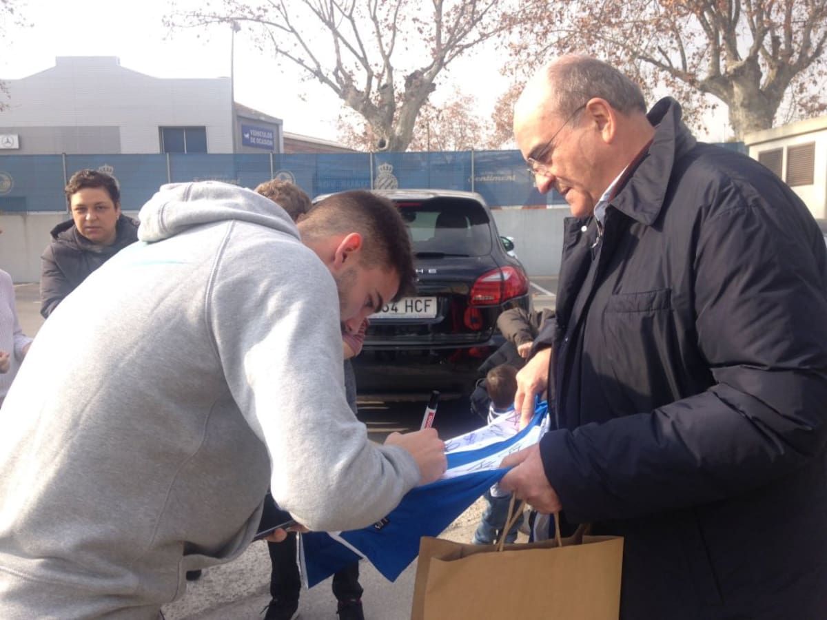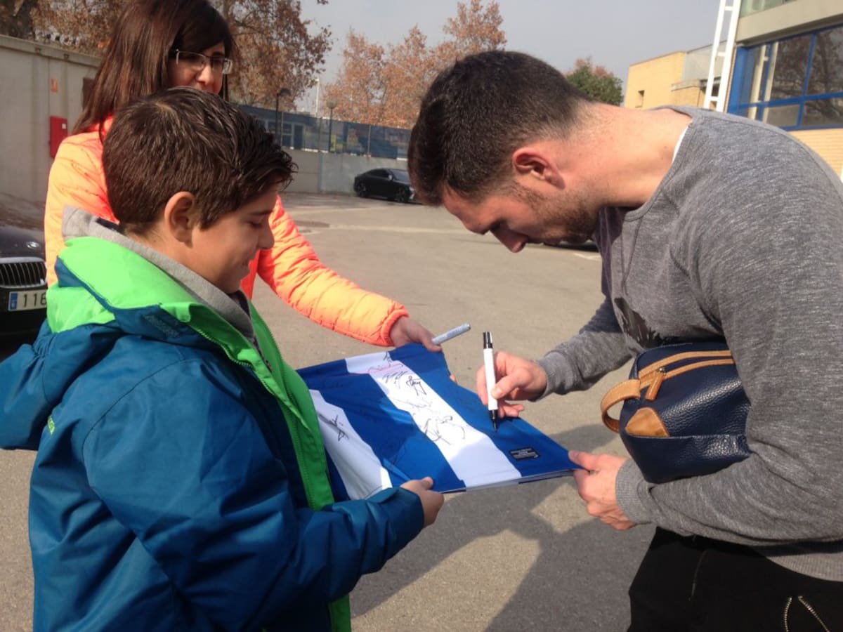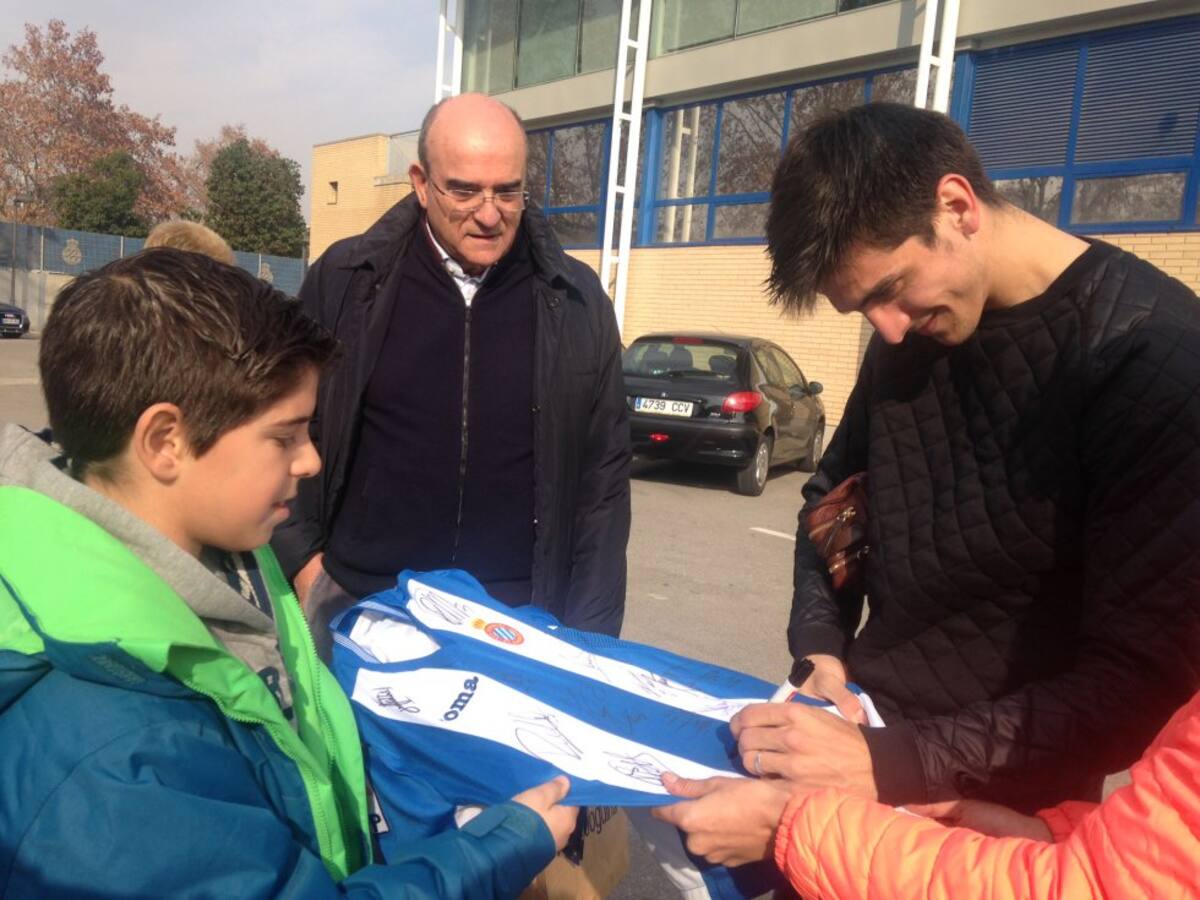 Adrià Honrrubia i Juan Luis Grafulla rebuts pels jugadors de l'Espanyol després de ser els guanyadors dels objectes del 'Cap Nen Sense Joguina'
