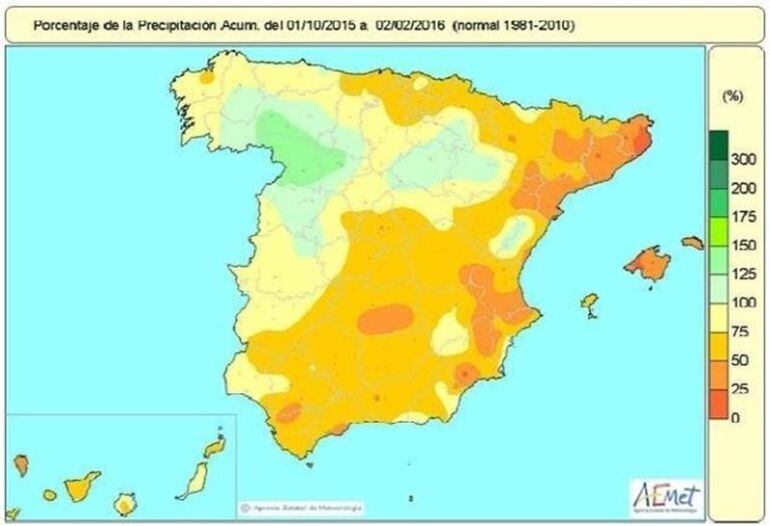 El valor medio nacional de las precipitaciones acumuladas desde el pasado 1 de octubre hasta el 2 de febrero de 2016, alcanza 230 litros por metro cuadrado, es decir, un 24% menos de lo normal, que serían 304 litros por metro cuadrado, según la Agencia Estatal de Meteorología (AEMET).