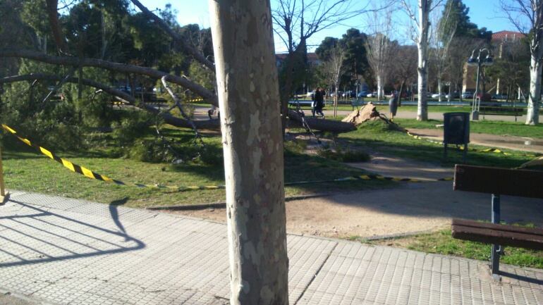 Las fuertes rachas de viento han tirado este árbol situado en el Campus San Francisco de la Universidad de Zaragoza.