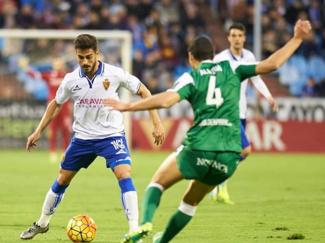 Javi Ros disputando un balón frente al Leganés el día de su debut como zaragocista / Real Zaragoza