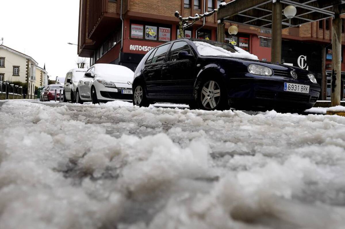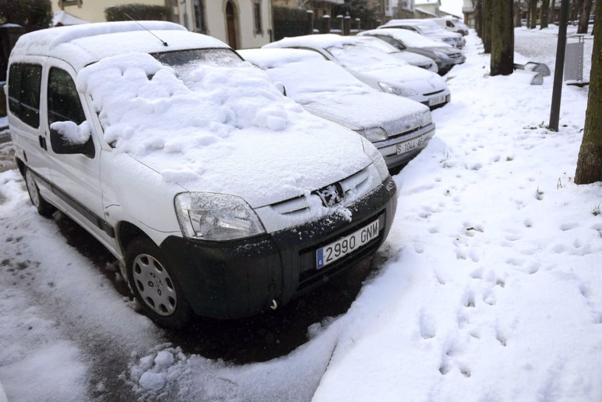 Varios coches aparcados en una calle en Reinosa, a cuya localidad no se podía llegar ni por la autopista A-67 ni por la N-611, cortada al trafico por la Guardia Civil a primera hora de la mañana y cuya comunidad se encuentra en alerta por nevadas debido a