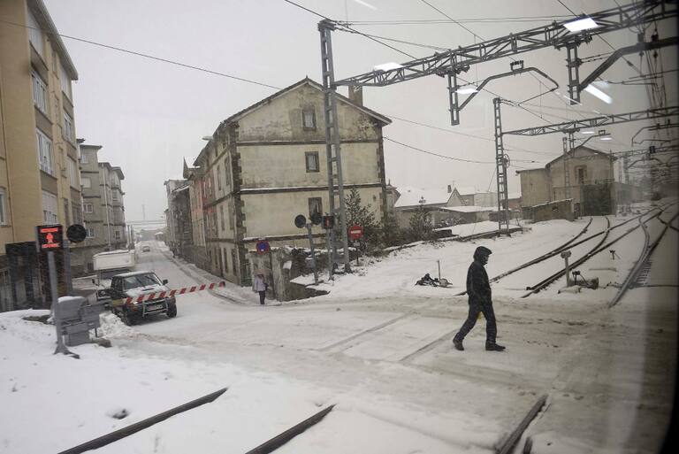 Una persona cruza las vías del tren en Reinosa, a cuya localidad no se podía llegar ni por la autopista A-67 ni por la N-611, cortada al trafico por la Guardia Civil a primera hora de la mañana y cuya comunidad se encuentra en alerta por nevadas debido a