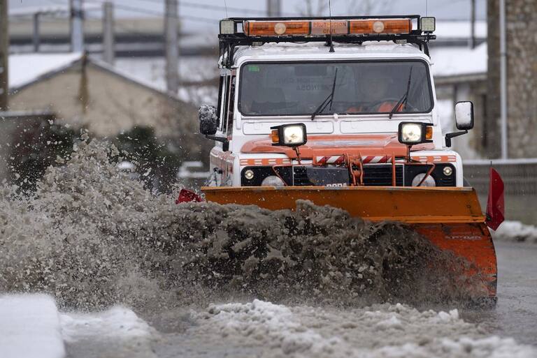 Una quitanieve limpia una calle en Reinosa, a cuya localidad no se podía llegar ni por la autopista A-67 ni por la N-611, cortada al trafico por la Guardia Civil a primera hora de la mañana y cuya comunidad se encuentra en alerta por nevadas debido a la m