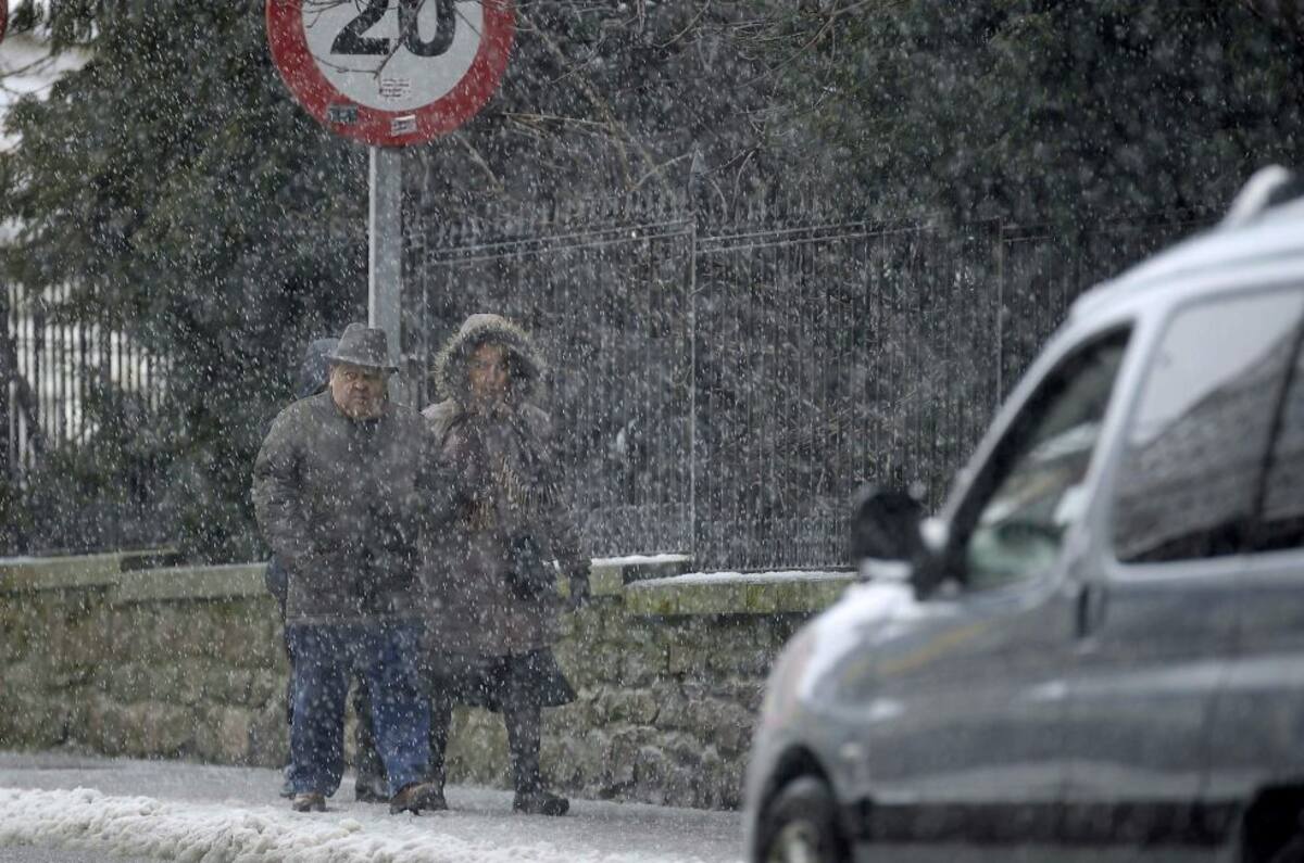Varias personas caminan por una calle en Reinosa, a cuya localidad no se podía llegar ni por la autopista A-67 ni por la N-611, cortada al trafico por la Guardia Civil a primera hora de la mañana y cuya comunidad se encuentra en alerta por nevadas debido
