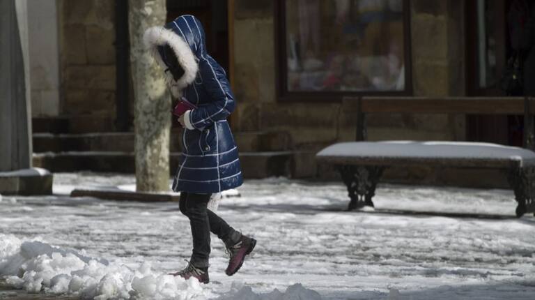 Una transeúnte camina sobre la capa de nieve que ha cubierto las calles del municipio de Reinosa (Cantabria), durante un temporal en el que la cota de nieve se instaura entre 700 y 900 metros, las temperaturas mínimas se encuentran en descenso y las máxim