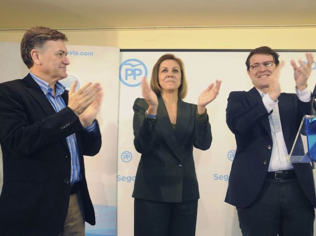 La secretaria general del PP, María Dolores de Cospedal (c), junto al secretario autonómico, Alfonso Fernández Mañueco (d), y el presidente provincial, Francisco Vázquez (i), aplaude al término del acto con alcaldes de su partido en la provincia de Segovi / Pablo Martín (EFE)