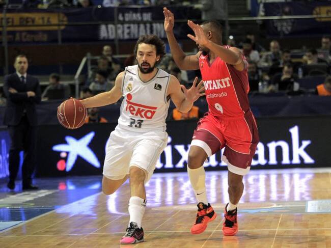 GRA383. A CORUÑA, 19/02/2016.- El base del Real Madrid Sergio Llull (i) avanza ante la defensa del base congoleño Jonathan Tabu (d), del Montakit Fuenlanbrada, durante el partido de cuartos de final de la Copa del Rey que se disputa esta noche en el Colis / Kiko Delgado (EFE)