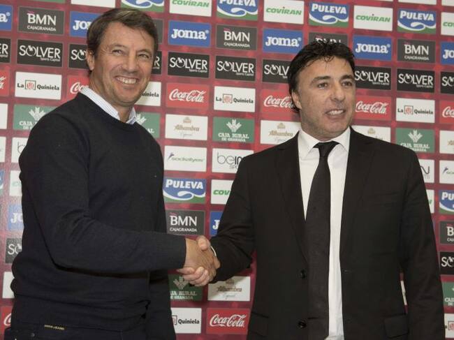 El nuevo entrenador del Granada, José González (i), junto al presidente del club, Enrique Pina, se estrechan la mano durante la presentación hoy del técnico tras la destitución de José Ramón Sandoval / MIGUEL ANGEL MOLINA (EFE)