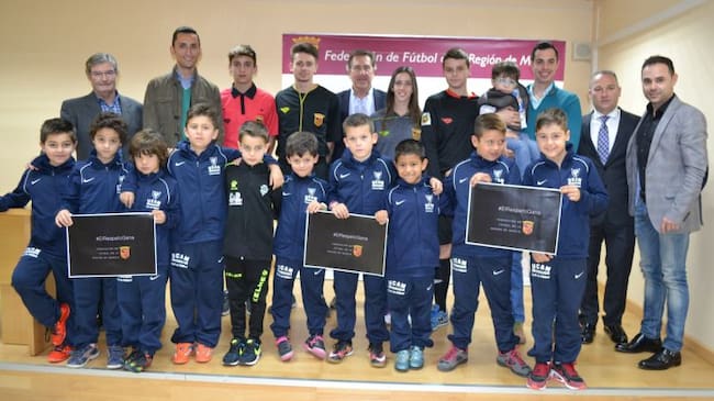 Este sábado la iniciativa se llevará a cabo en las categorías en edad prebenjamín, en la siguiente semana tocará a los benjamines, en la del 12 de marzo a los alevines, luego a los infantiles y concluirá el 2 de abril con las competiciones cadetes. La campaña fue presentada este martes por José Miguel Monje Carrillo, presidente de la Federación Murciana y le acompañó, entre otros, el colegiado Sánchez Martínez (lorquino y árbitro de Primera División).