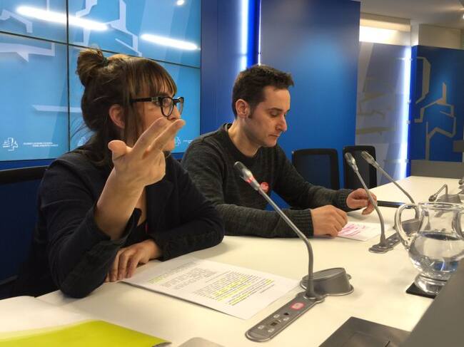 Los parlamentarios abertzales Lur Etxeberria e Iker Casanova durante la presentación de la inciativa / EH BILDU