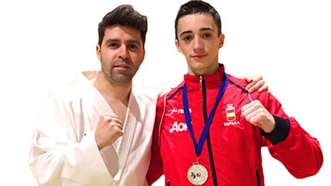 Alberto Moreno posa con la medalla conseguida en Chipre junto a su entrenador / C. Kárate Sergio Martínez