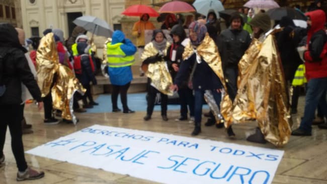 La concentración en Zaragoza ha sido al mediodía en la plaza de La Seo, bajo una intensa lluvia a la que se ha hecho frente con chubasqueros, paraguas y botas de agua, en la que, a través de música y pequeñas interpretaciones y recreaciones (como una barrera humana que impedía el paso de personas), se han reclamado rutas seguras en Europa que faciliten la llegada de refugiados y migrantes, así como la expedición de visados humanitarios, procesos de reasentamiento de refugiados, el acceso diplomático al asilo en terceros países, el fin de las actitudes y medidas denigrantes, racistas y xenófobas contra las personas refugiadas y la suspensión de los acuerdos de retorno suscritos por algunos países europeos.