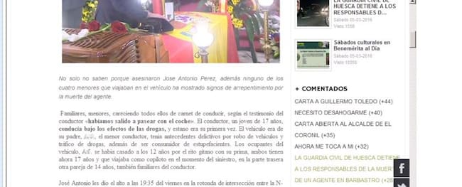 Así mismo, benemerita.org ofrece más datos sobre el presunto responsable de la muerte de José Antonio Pérez: El vehículo era del padre del conductor y éste último se había casado a los 12 años por el rito gitano con su prima, ambos tienen ahora 17 años, la cual viajaba como copiloto en el momento del siniestro. En la parte trasera iba la otra pareja de 14 años, también familiares del conductor.