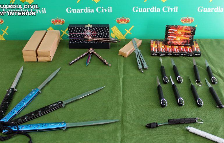 Se trata de una decena de armas blancas denominadas ‘kubotán’, cuatro puñales y tres navajas tipo ‘mariposa’ con hoja de doble filo.