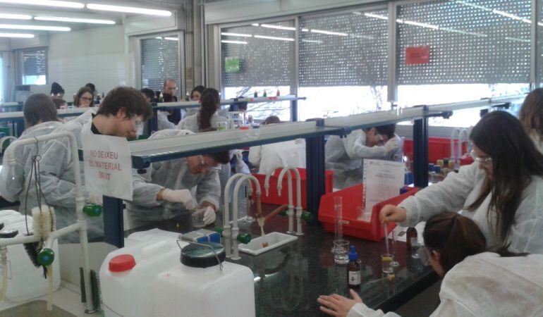 Alumnes de l'IES de Celrà i de l'Egara de Terrassa participen en una de les sessions que professors voluntaris del departament de ciències fan cada any per ensenyar als adolescents com esbrinar amb procediments químics senzills si una mostra conté substàncies dopants, com revelar les empremtes dactilars que deixem sobre els objectes o com trobar restes de sang en teixits.
