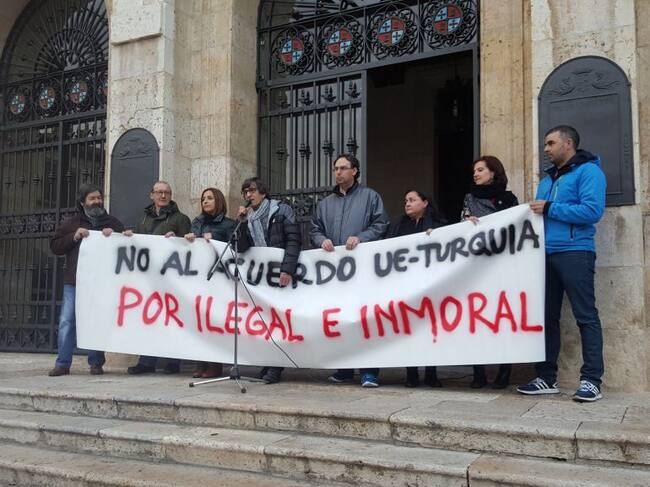 Organizaciones sindicales, sociales y partidos políticos convocaban esta concentración en la que se ha leído un manifiesto que incidía en calificar de vergonzoso e ilegal este acuerdo que vulnera la Carta Internacional de los Derechos Humanos, el artículo 19 de la Carta de Derechos Fundamentales de la UE y la Convención de Ginebra para los refugiados.