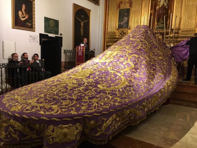 Manto de procesión de María Santísima de Consolación y Lágrimas bordado a realce en oro fino sobre terciopelo malva, de 8 por 5 metros. Realizado en los talleres de Salvador Oliver Urdiales sobre el diseño original del año 1928 (Madres Adoratrices)
