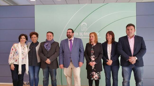 El delegado de Educación de la Junta, en el centro, posa con los alcaldes con los que ha firmado el acuerdo para la apertura de nuevos centros infantiles el próximo curso en varias localidades de la provincia de Granada / Rafael Troyano