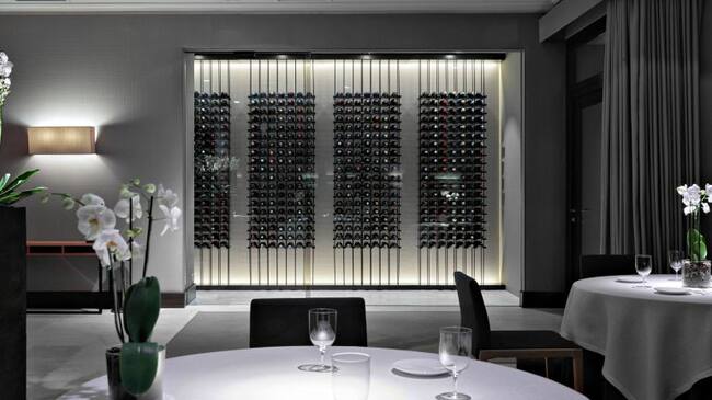 Según avanzan en un comunicado, "el nuevo proyecto da continuidad a la sala, de forma que la vinoteca queda integrada en la misma. Entelada con la misma tela y con el mismo suelo que el salón del prestigioso restaurante, unas puertas correderas de cristal en color cobre dan paso a este nuevo espacio. En ella se encuentran 6 módulos y en cada uno de ellos hay cavidad para 144 botellas, que están expuestas a la mirada de los comensales." Para darle calidez, el sistema de iluminación es a través de tiras de leed en color amarillo.