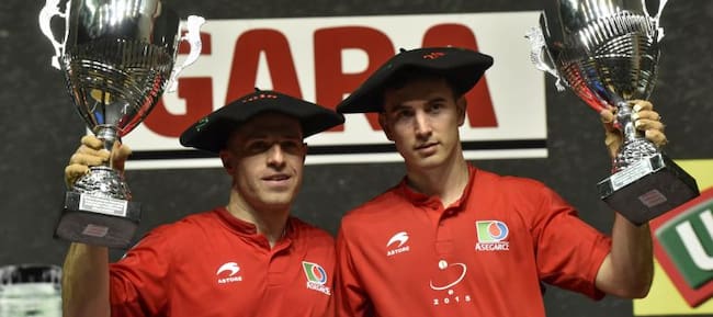 Aimar Olaizola (i) y Mikel Urrutikoetxea se han proclamado campeones del Campeonato Parejas 2016, uno de los tres grandes torneos de Mano, la especialidad reina de la Pelota Vasca, tras la retirada por lesión de Juan Martínez de Irujo, que jugaba con Beña / Miguel Toña (EFE)