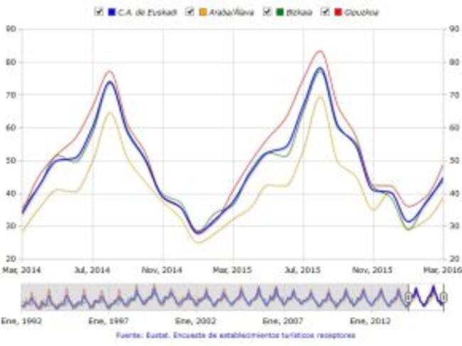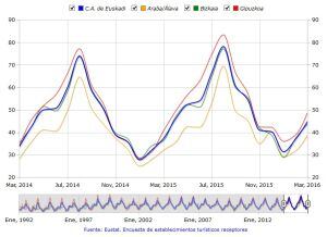 La entrada de viajeros en Euskadi ha crecido con respecto al pasado año un 7,9 % en Semana Santa, periodo durante el cual el grado de ocupación por habitaciones fue del 80,4 % en los establecimientos hoteleros, un 2,6 % más que en 2015.