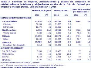 Por territorios, hubo una ocupación por habitaciones del 73,6 % en Álava, del 79,1 % en Bizkaia y del 84,8 % en Gipuzkoa, lo que con respecto al grado de ocupación de la Semana Santa de 2015 implicó un incremento del 3,6 %, del 3 % y del 1,6 %, respectivamente.