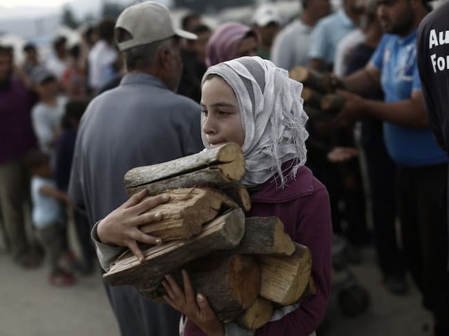 Una niña refugiada lleva leña proporcionada por agencias humanitarias en un campo de refugiados improvisado en Idomeni (Grecia) cerca a la frontera con Macedonia / KOSTAS TSIRONIS (EFE)