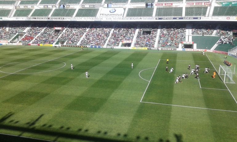 Poco a poco, el Elche fue desgastando al Albacete y encontrando huecos por los que llegar a su área. Sergio León probó a Juan Carlos con un lanzamiento de falta que el portero pudo sacarse de encima.