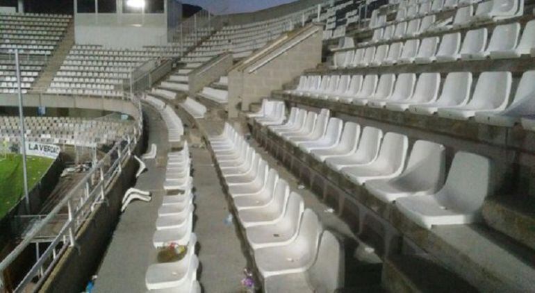 El derbi entre Cartagena y Real Murcia deja algo de cola. Más allá del duelo entre ambos equipos, y la deportividad mostrada en el terreno de juego, el comportamiento de una minoría de ambas aficiones empañó el ambiente una vez acabado el choque. Los seguidores granas fueron ubicados en el Fondo Norte, desde donde fueron increpados por unos pocos albinegros, y en esa misma zona, el Fondo Norte, se arrancaron algunas butacas, tal y como denuncia el concejal de deportes de Cartagena Ricardo Segado.