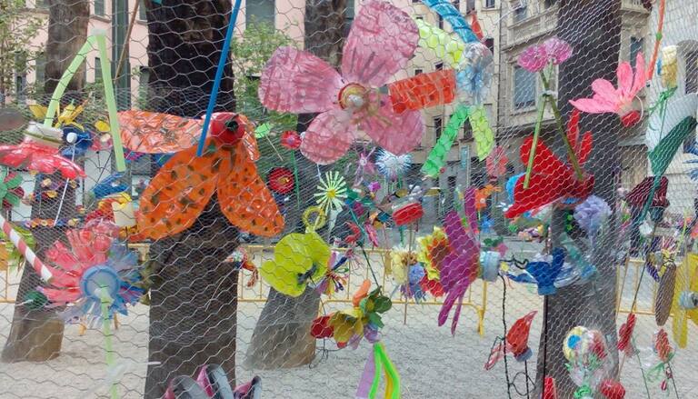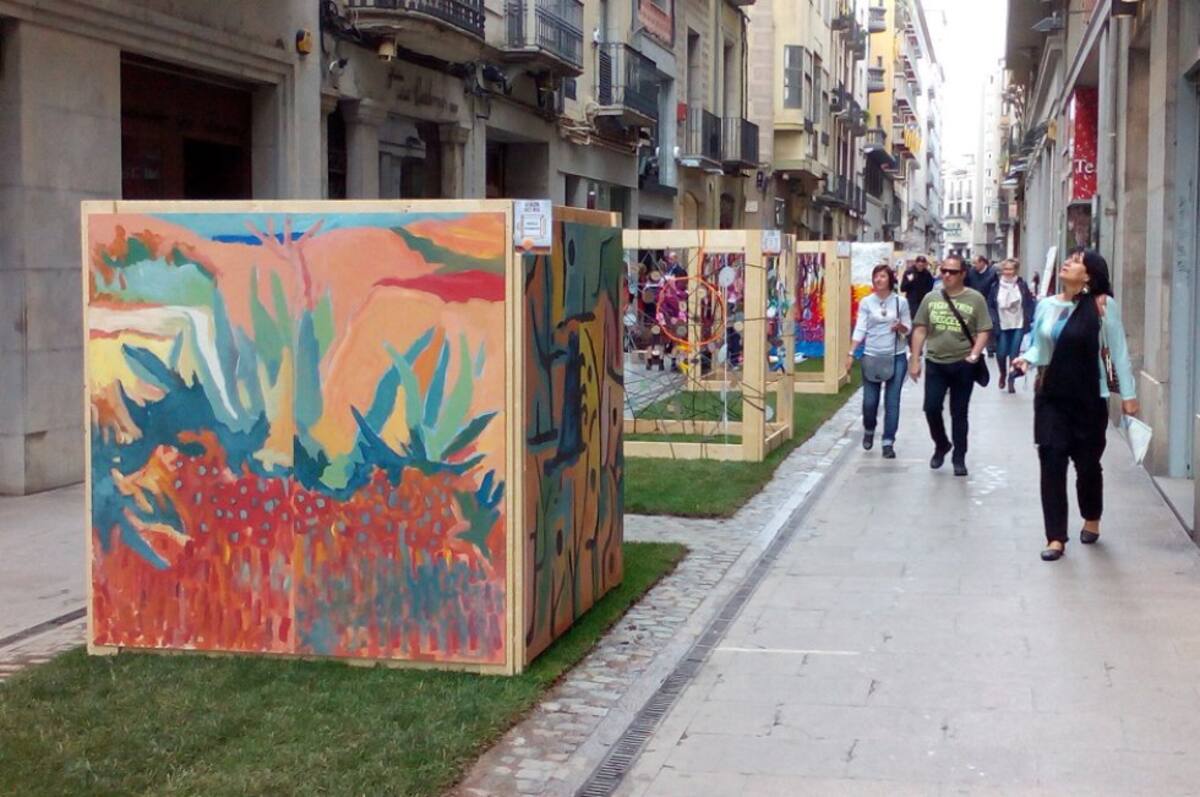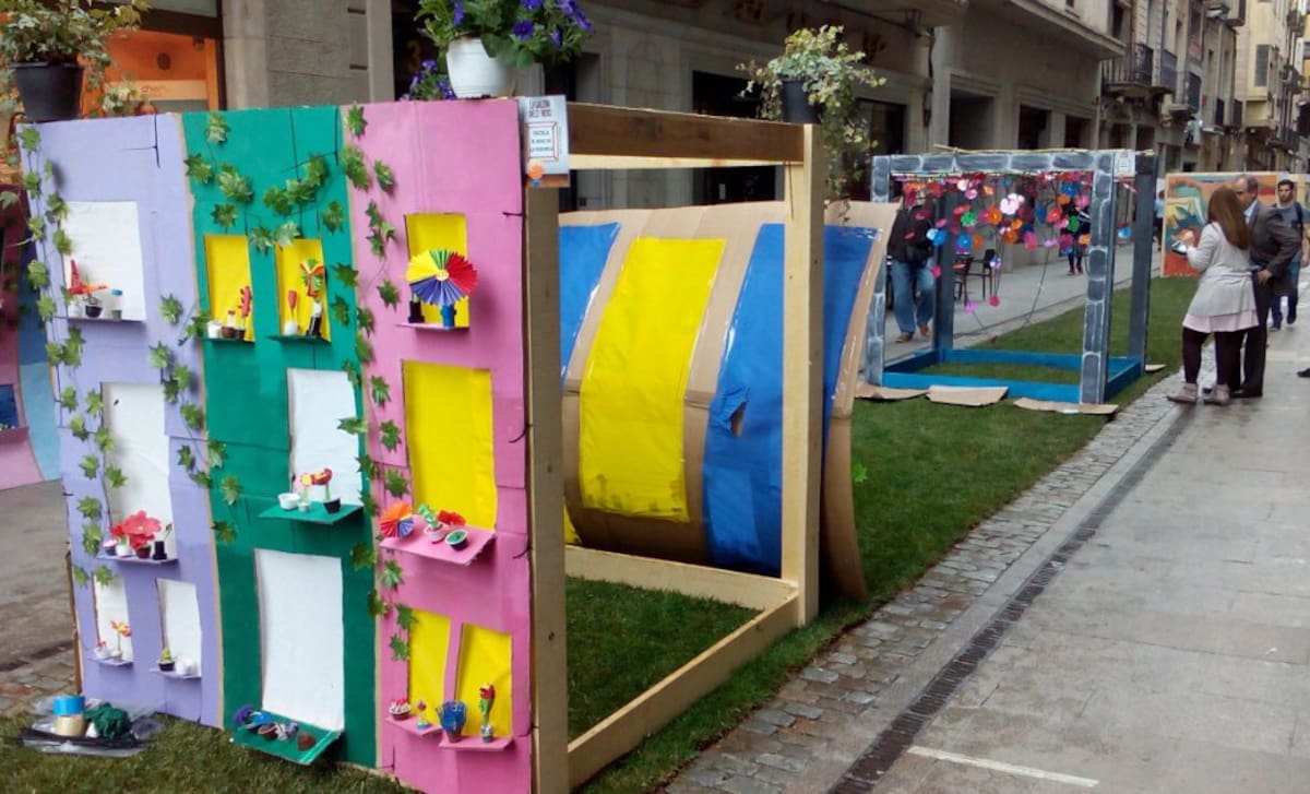 Hi ha muntatges fets per escoles al carrer Nou. Descansen en estructures de fusta sobre una catifa de gespa.