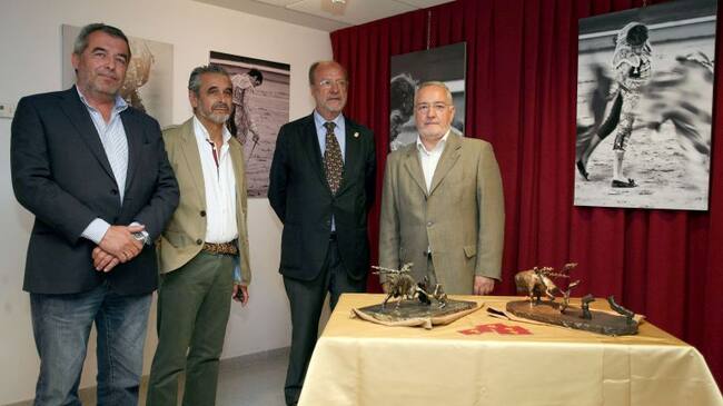 Tauroinstantes', en el Museo del Toro. De izquierda a derecha, el escultor Feliciano Giles; el direcor del museo, Jorge Manrique; el alcalde de Valladolid, Javier León de la Riva; y el fotógrafo Rafael Villar / Agencia Ical