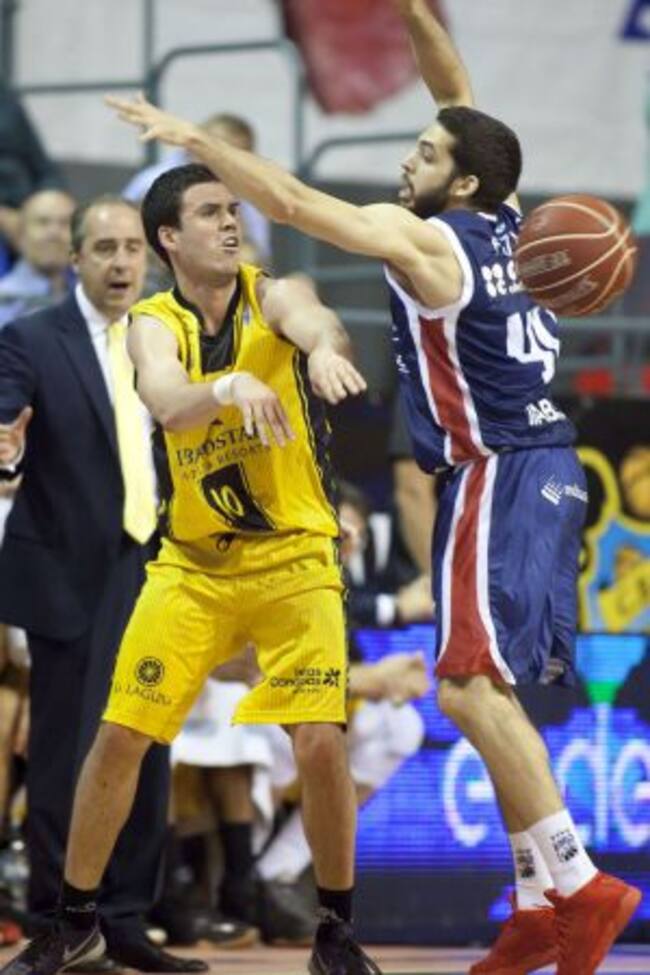 El base del Iberostar Tenerife, Daniel Pérez (i), realiza un pase ante el jugador del Rio Natura, Pepe Pozas / Ramón de la Rocha