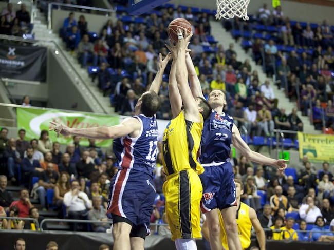 El pivot montenegrino del Iberostar Tenerife, Blagota Sekulic (c), disputa un rebote ante los jugadores del Rio Natura, el estadounidense Aleksandar Maric (i) y el alero lituano, Eimantas Bendzius, durante el encuentro correspondiente a la jornada de liga / Ramon de la Rocha (EFE)