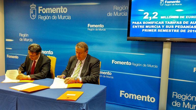 La consejería de Fomento y la empresa Lat Bus han firmado el convenio de subvención del billete de autobuses interurbanos a pedanías. Sin esos dos millones y medio de euros, el precio sería un 40 % superior.