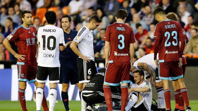 El delantero argentino argentino del Valencia Pablo Piatti tras sufrir una lesión durante el partido de la trigésimo octava jornada de liga que disputan frente a la Real Sociedad en el estadio Mestalla de Valencia. EFE-Juan Carlos Cardenas / Juan Carlos Cardenas (EFE)