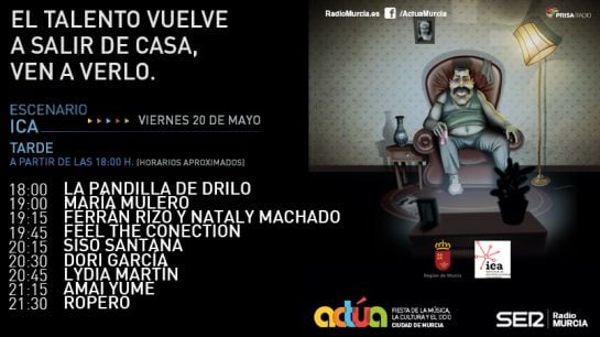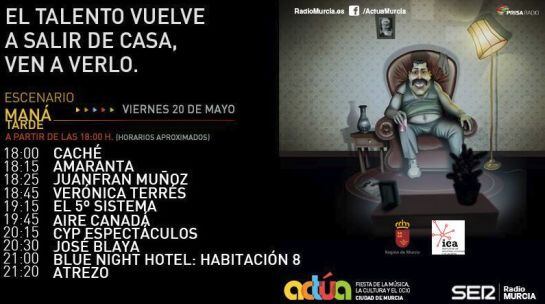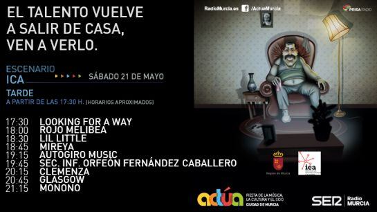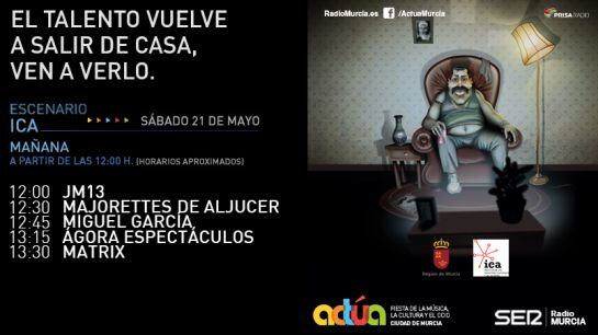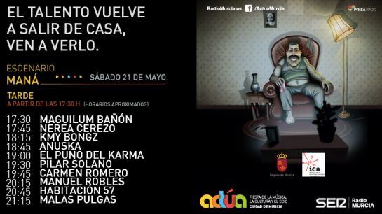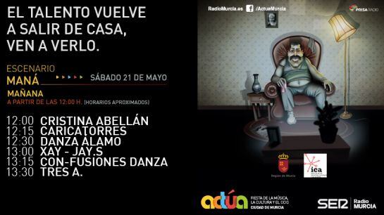 La Cadena SER organiza esta cuarta edición de Actúa, una muestra abierta a todas las disciplinas artísticas que pretende promover la música y el arte en Murcia, ofreciendo a los artistas y músicos de todo género un escenario para darse a conocer y expresar su arte. Murcia será la primera ciudad en dar una oportunidad de mostrar su talento a cerca de 50 grupos de toda la comunidad. Diez horas de música -de 18:00 a 22:00h el viernes, y de 12:00 a 14:00 y 18:00 a 22:00h el sábado- en la Plaza de Santo Domingo, donde se podrá disfrutar tanto de pop, como de rock, danza, humoristas e incluso espectáculos de magia.