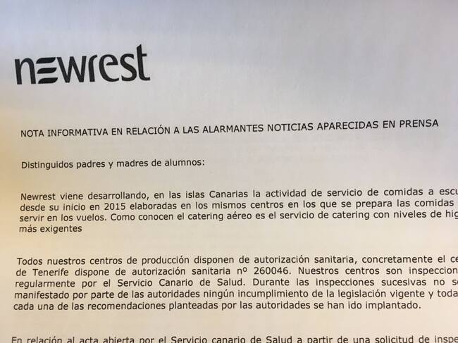 La alarma social suscitada después de que la Policía Local de Santa Cruz de Tenerife encontrara comida en mal estado en una furgoneta de reparto destinada a centros escolares, ha motivado que Newrest, empresa responsable del servicio de cátering a pronunciarse públicamente. En un comunicado, la empresa asegura que cumple con todos los requisitos de seguridad alimentaria y que cuenta con las preceptivas autorizaciones sanitarias. En relación al acta abierta por el Servicio canario de Salud a partir de una solicitud de inspección planteada por la Policía Local de Santa Cruz de Tenerife, Newrest informa que el trasvasé de productos de un vehículo a otro en vía pública es una operación conforme a la legislación alimentaria siempre que se haga en condiciones de respeto a la seguridad alimentaria. Del mismo modo, la empresa asegura que los denominados residuos sólidos del acta son "sándwiches no consumidos en el citado servicio y las bandejas utilizadas en el mismo transportadas en contenedores de aluminio cerrados, depositados en el camión inspeccionado completamente separados de los alimentos destinados a las escuelas". Además, "todos los alimentos destinados a las escuelas se encentraban en otra zona del vehículo y en el interior de contenedores isotermos o envasados individualmente y en bolsas de plástico por lo que existía, en el momento de la inspección, una separación suficiente y efectiva entre ambos productos", señala el comunicado de la empresa.