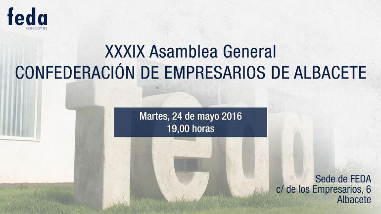 Este martes 24 de mayo, FEDA celebrará su XXXIX Asamblea General. Tendrá lugar en su sede de Albacete (c/ de los Empresarios, 6), a las 19,00 horas. La apertura de esta reunión correrá a cargo del presidente de CEPYME, Antonio Garamendi.