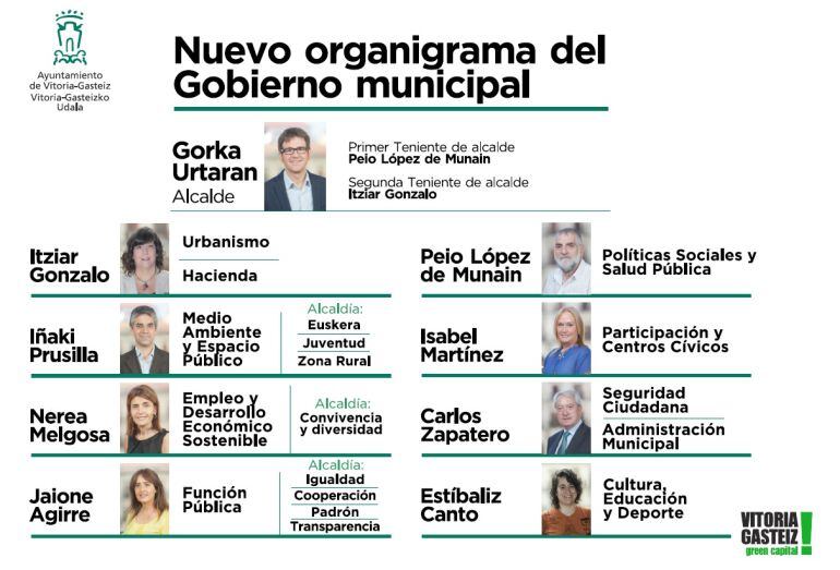 Los nacionalistas estarán al frente de los departamentos de Hacienda que dirigirá Itziar Gonzalo; Iñaki Prusilla estará al frente de Medio Ambiente y Espacio Público; Nerea Melgosa gestionará Empleo y Desarrollo Económico; y Jaione Aguirre, Función pública.