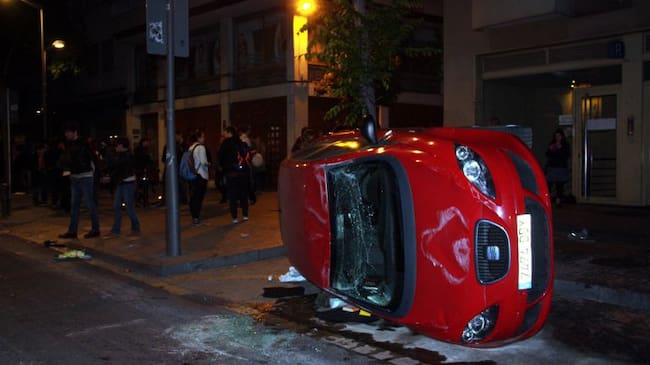 Un cotxe bolcat a Travessera de Gràcia, davant el Banc Expropiat, després d'una manifestació en protesta del seu desallotjament / Fíguls L. (ACN)