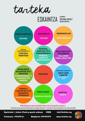 El amplio abanico de actividades busca especialmente despertar la creatividad y la realiación de manualidades. Este centro ofrece también la posibilidad de celebrar cumpleaños. Tarteka no quiere ceñirse exclusivamente a la población infantil, por lo que oferta asimismo un programa de actividades para adultos.