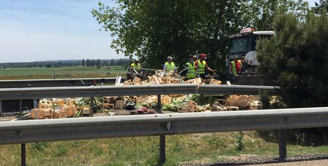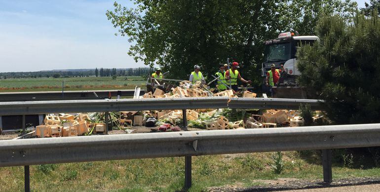Vuelco de un camión de fruta en la A-62