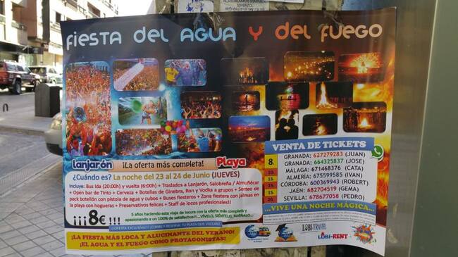 Aparecen carteles en Granada y otras capitales andaluzas con viajes baratos a la Noche del Agua y la de San Juan